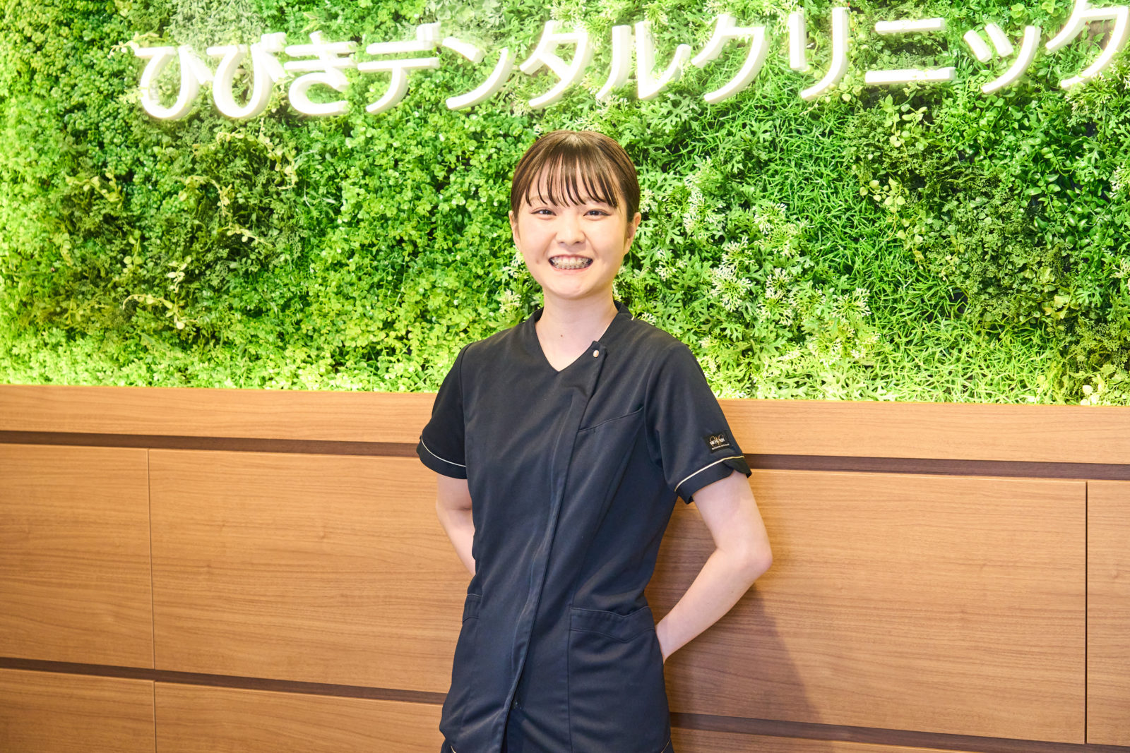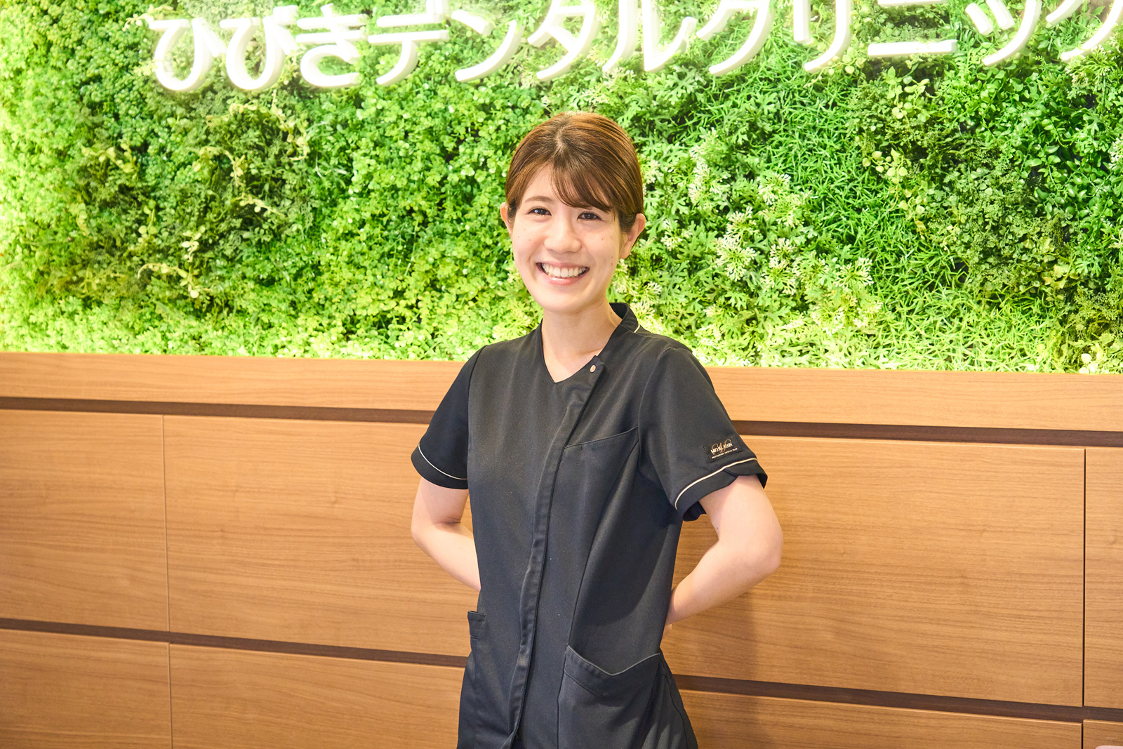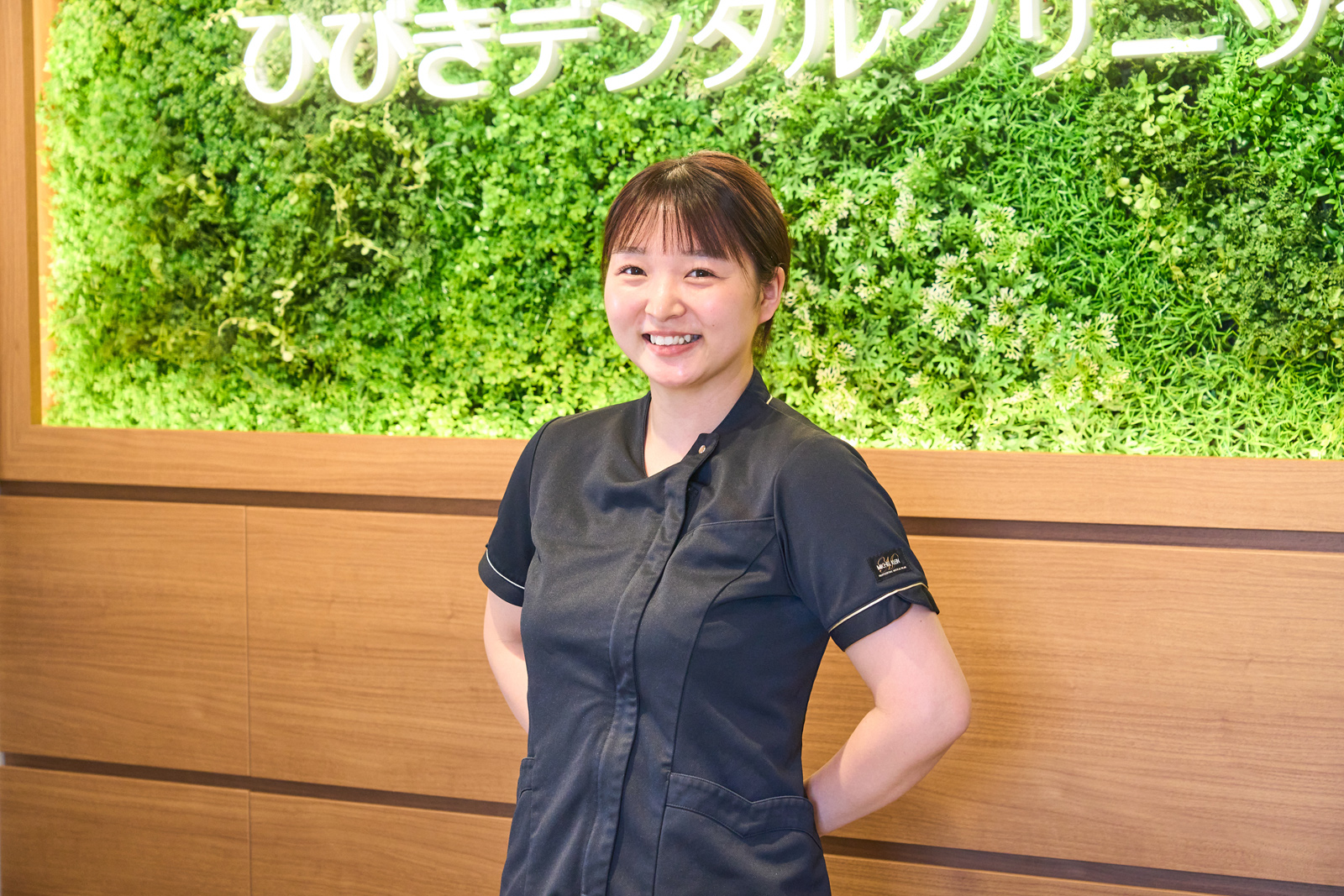 私は幼いとき、歯医者さんが怖いと感じていました。その頃のイメージとは違い、当院は優しくて明るい歯科医院です。安心して通っていただけると思います。ドクターと衛生士に負けないぐらい、歯科や保険に関するさまざまな知識を身につけようと、勉強しながら日々頑張っています。何でも気軽に聞いてくださいね。